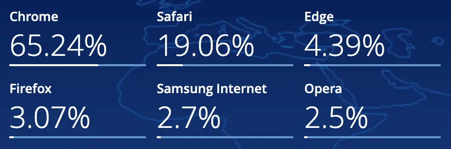 The company StatCounter conducted a survey recently and found that 65.24% of websites are accessed via Chrome! Followed by almost 20% accesses via Safari and others with less than 5% each.