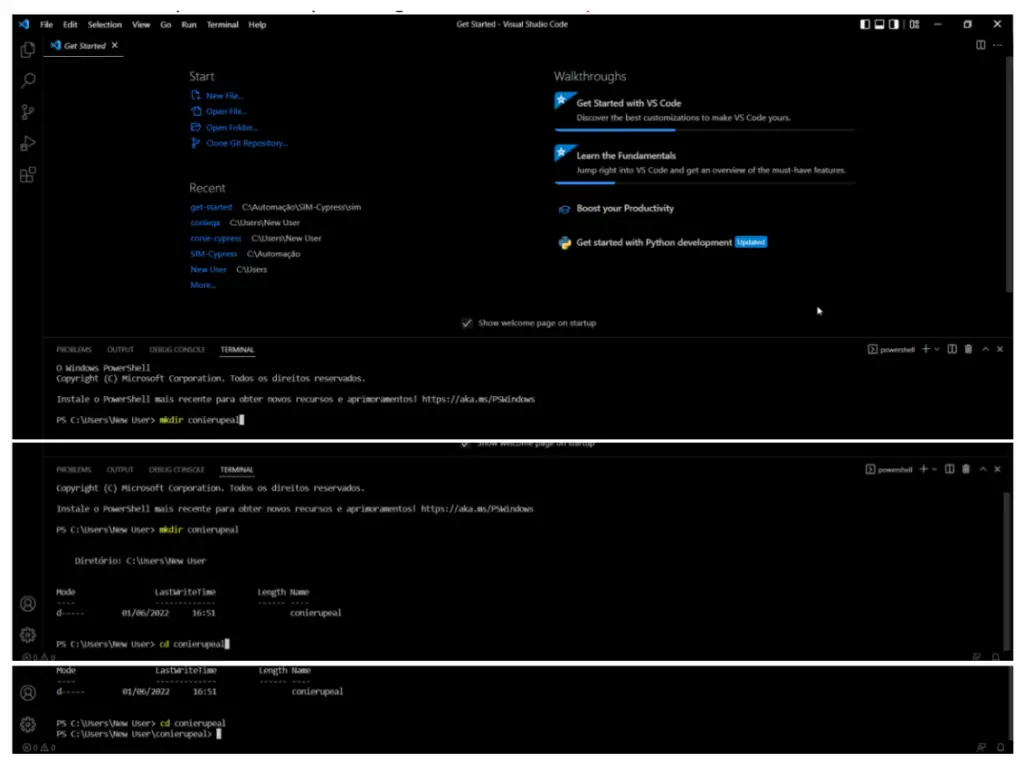Criar uma pasta onde irá instalar o projeto cypress. Abra o VS Code e clique em terminal, digite mkdir nomedapasta e tecla enter e depois entre na pasta digitando cd nomedapasta