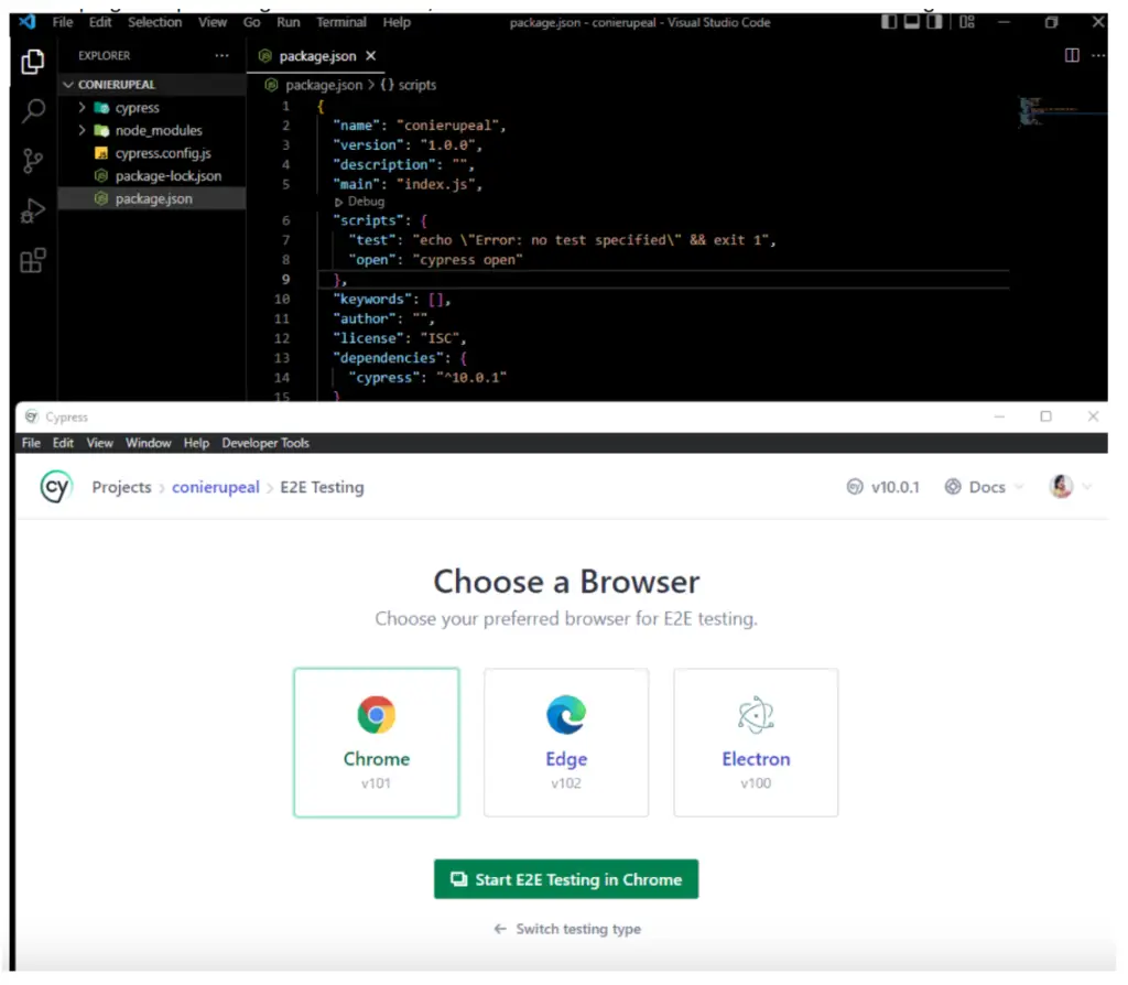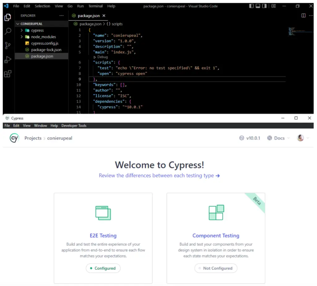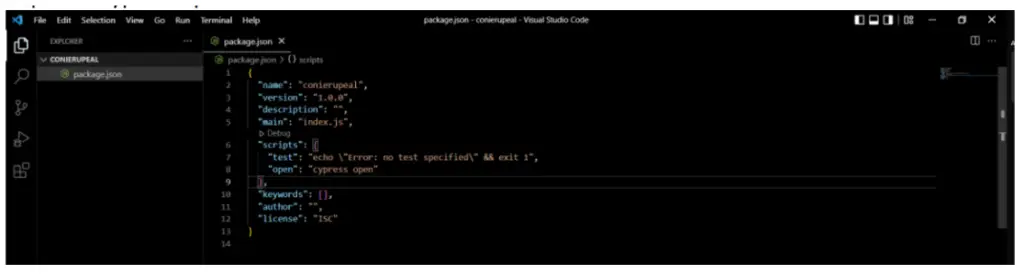 Para executar o Cypress pela primeira vez de forma simples e rápida, vamos editar o arquivo package.json inserindo o comando abaixo em “scripts”: