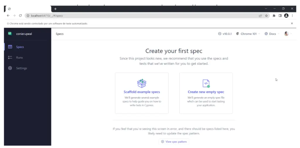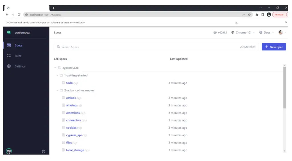 O Cypress abrirá uma interface bastante amigável para acompanhar a execução dos testes enquanto os arquivos specs são editados.