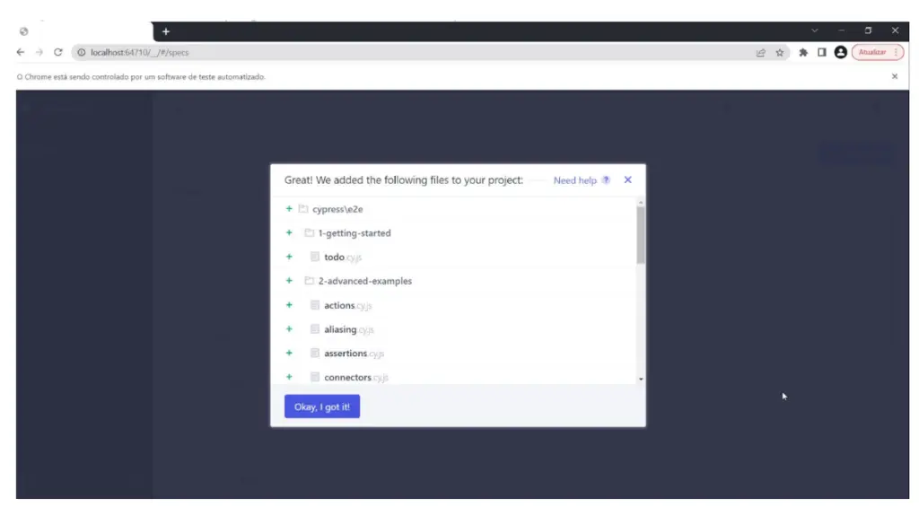 Vou clicar em “Scaffold example specs” para visualizar os exemplos que o Cypress disponibiliza.