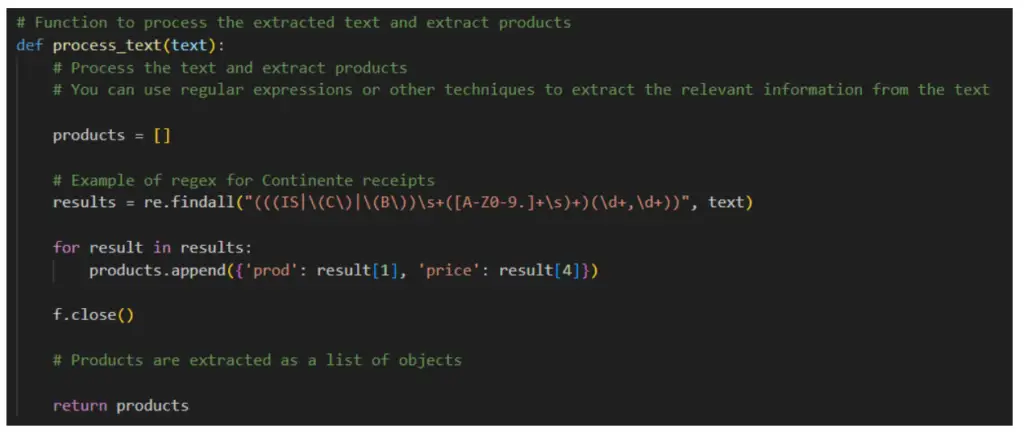 Once the text is extracted, it goes through further processing to extract relevant information, such as the purchased products. This can be done with various methods, including regular expressions (Regex) or other text processing techniques. In this example, we output the extracted products as a list of strings: