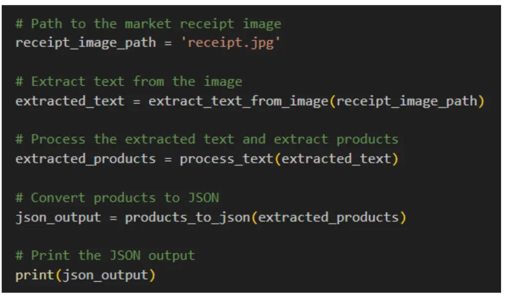 To begin with, we implement Optical Character Recognition (OCR) techniques to extract text from supermarket receipts. This is possible thanks to the powerful pytesseract library. By using OpenAI’s ChatGPT, an advanced language model, we have crafted the code below to execute this task: