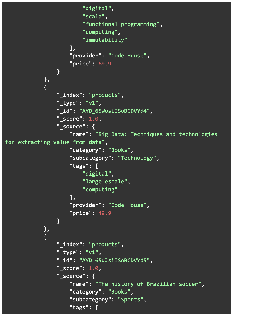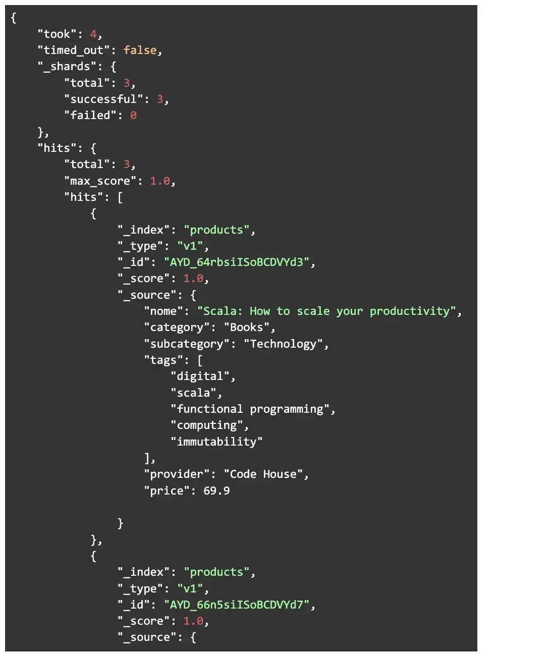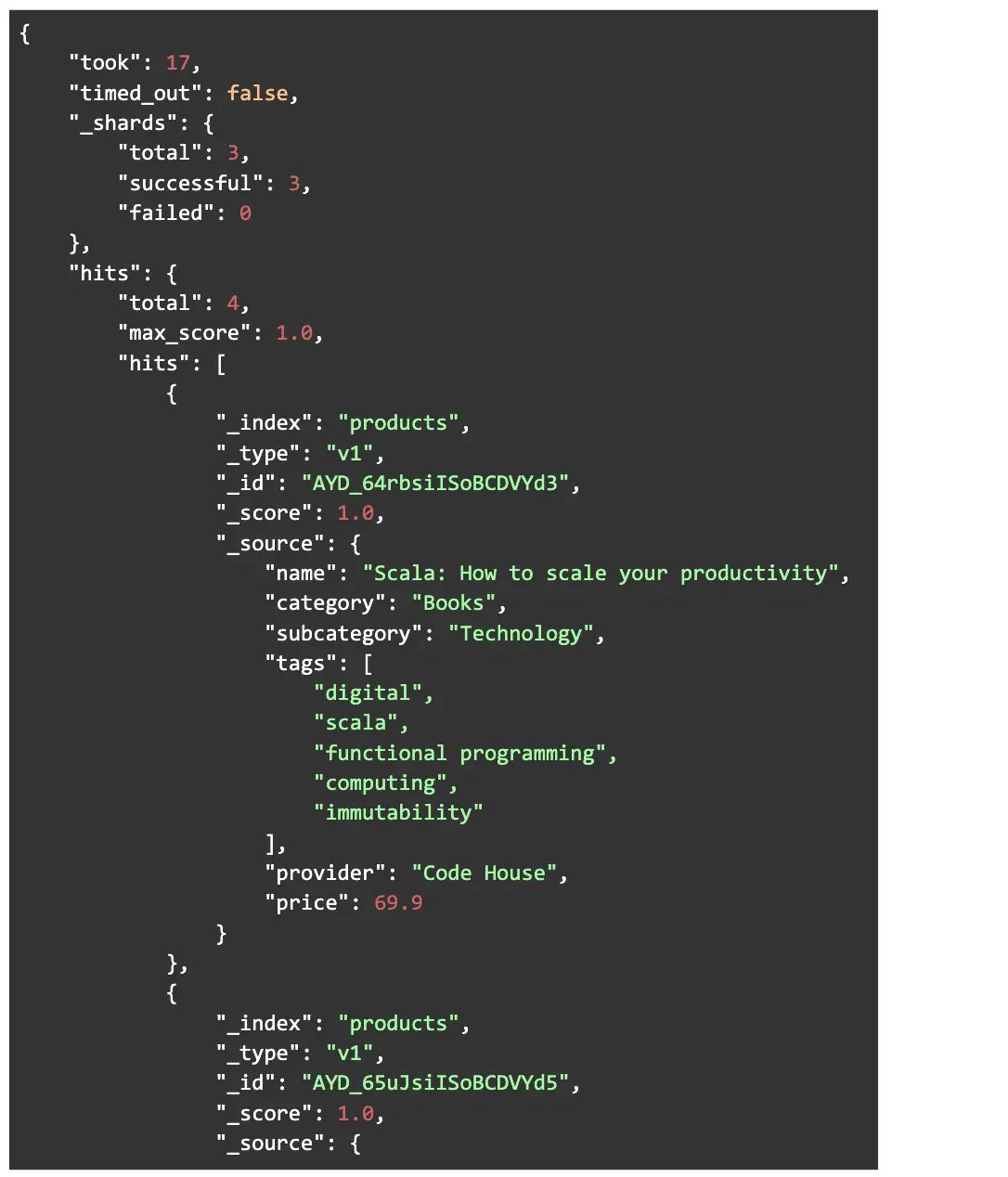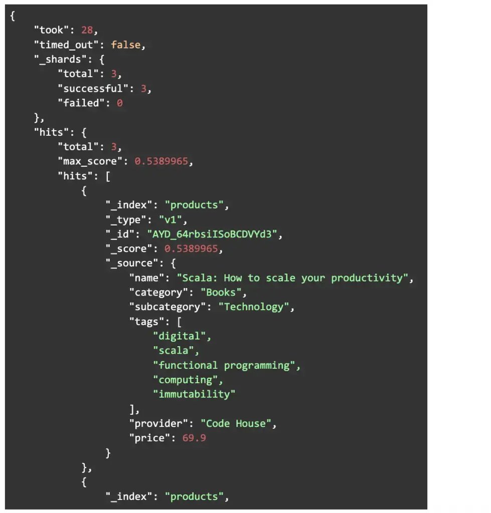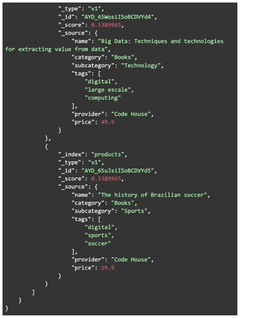 In the response, we can notice that all the records with the field “category” having the value equal to “Books” were returned, each one with a specific score that represents how much the field value is alike to the searched term. No matter how much the term matches the value, the scores will always be different due to the ES analysis process.