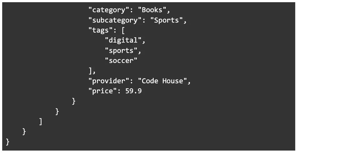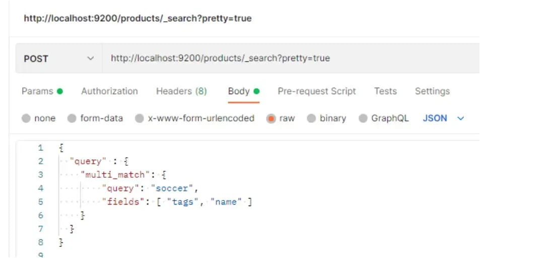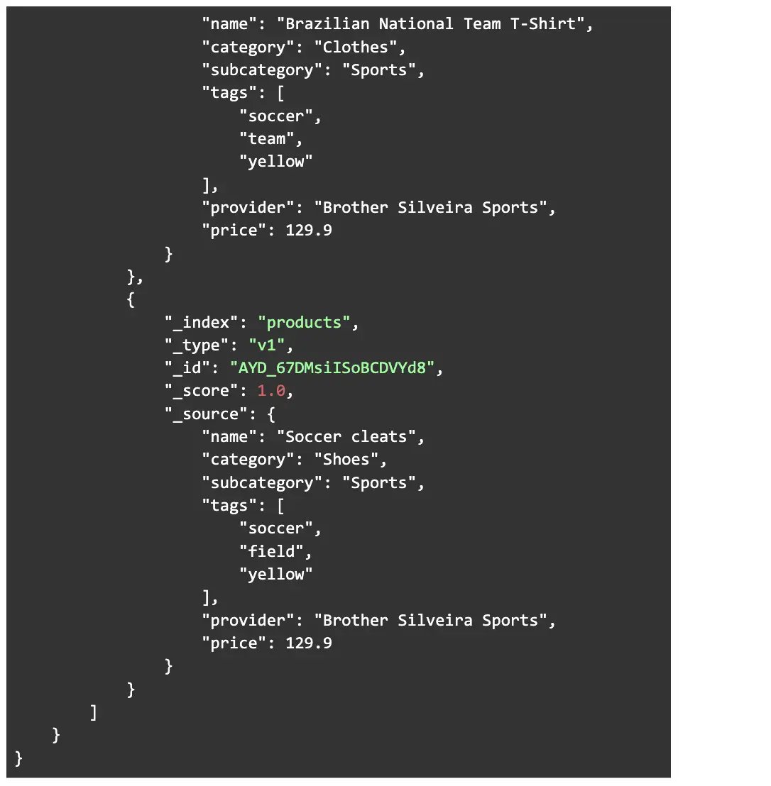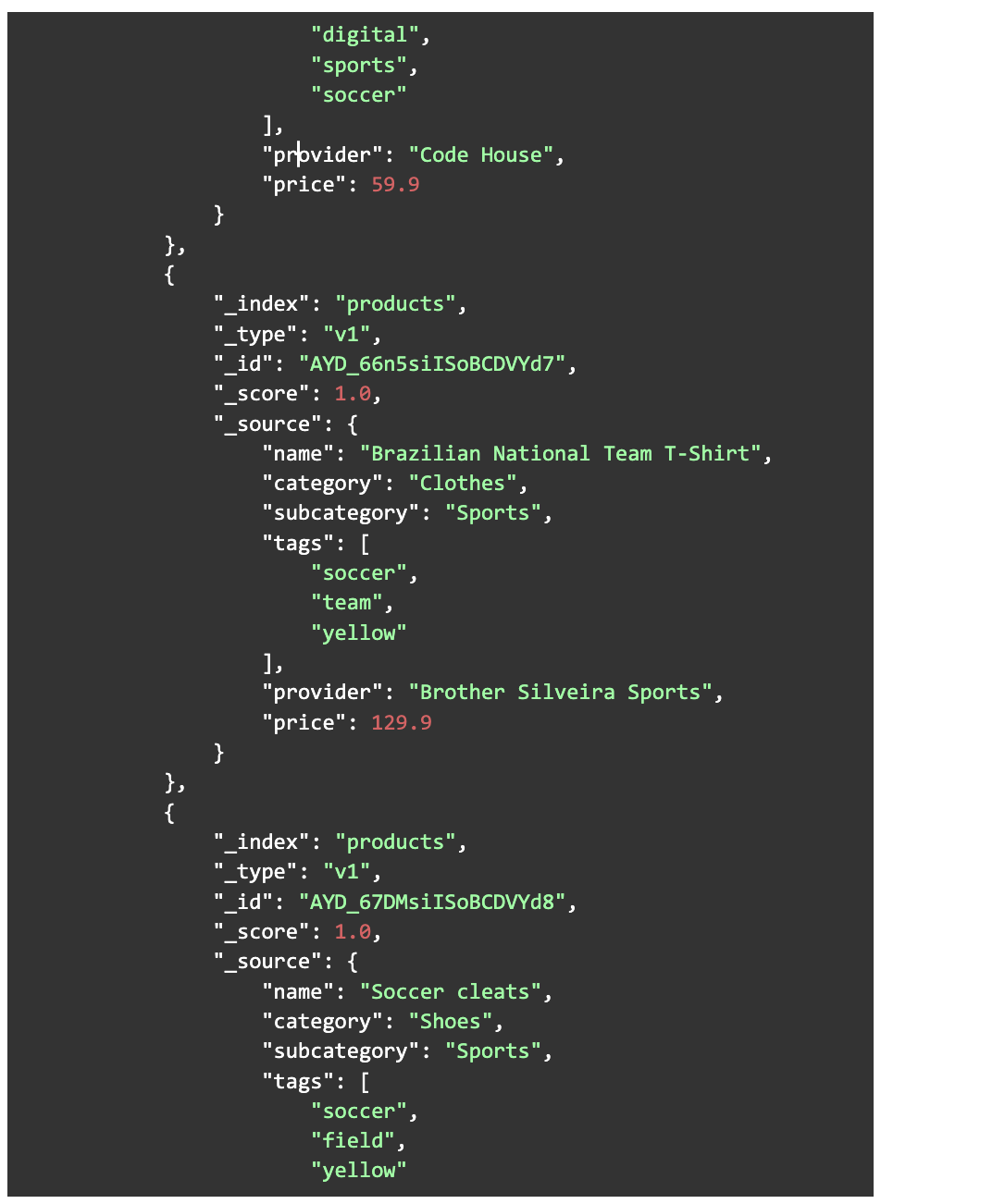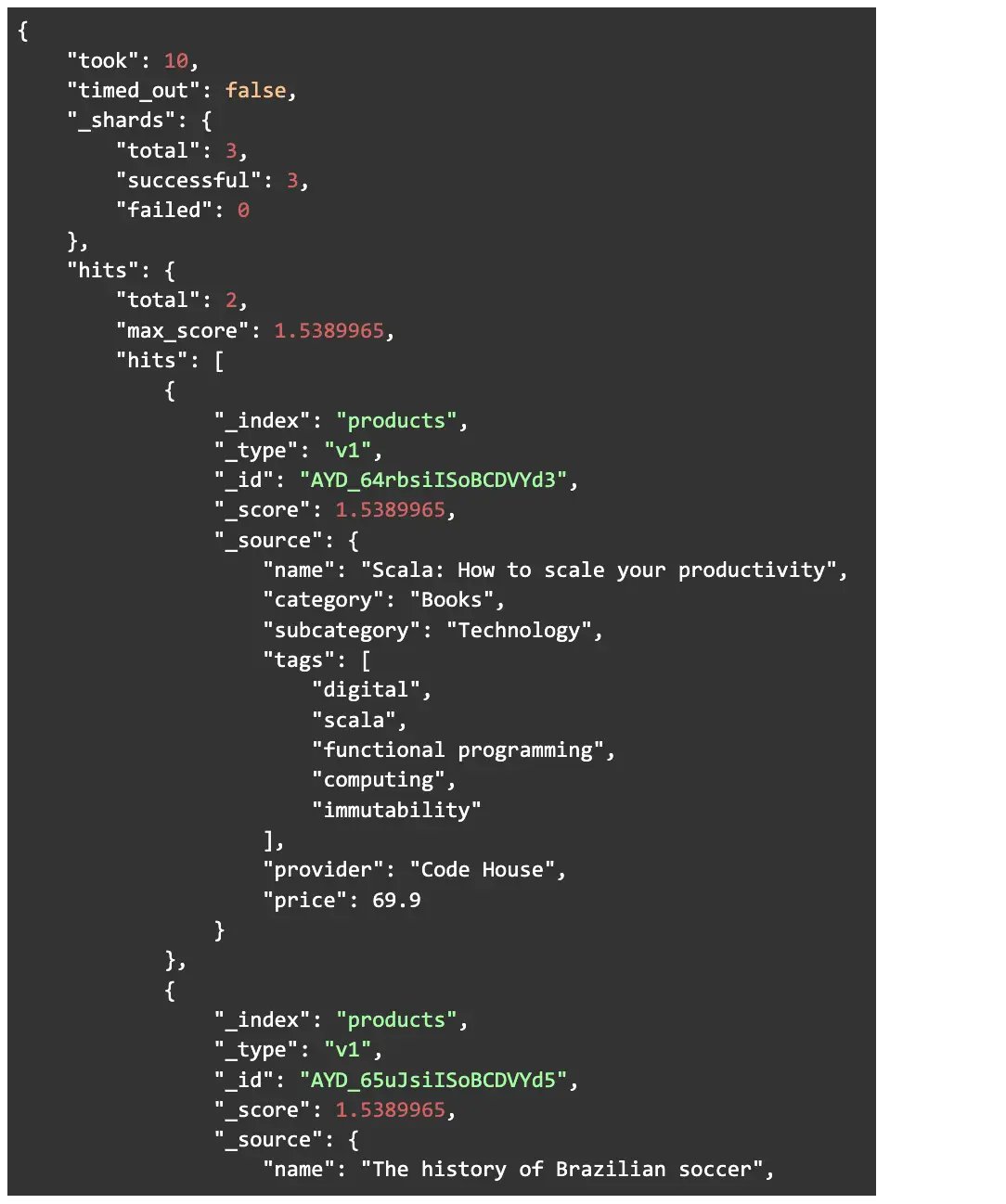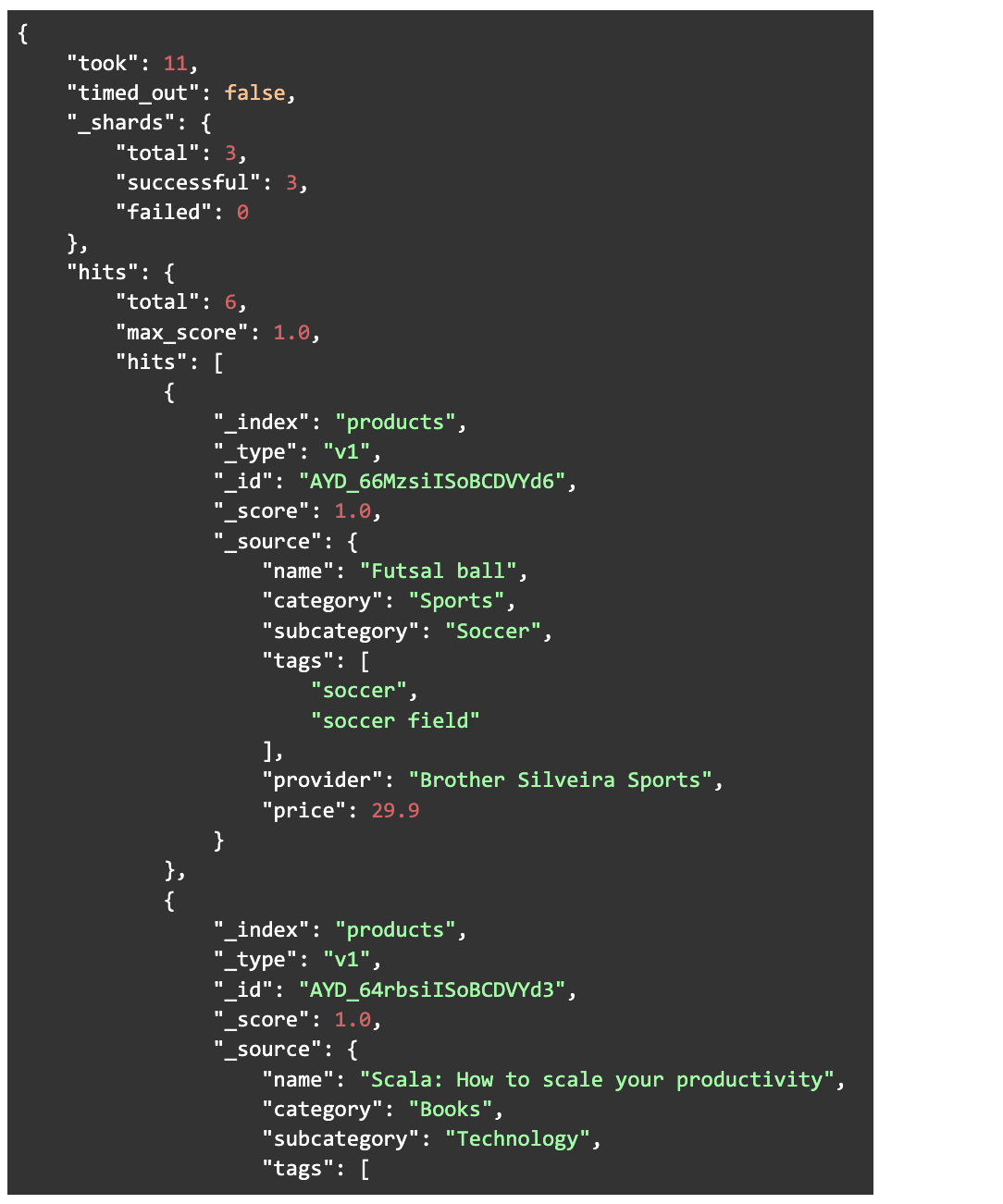 Notice that this query searches for the term “soccer” in both “tags” and “name” fields. Now let’s look at the response: