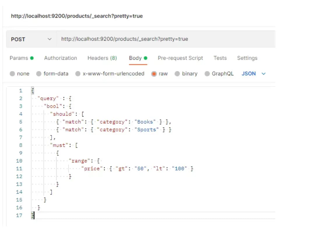 In the example below, we’re searching for records whose “category” field matches “Books” OR “Sports”. This is possible due to the term “should”, which supports the number of conditions that we need. We can also notice that we are adding an AND condition that is represented by the “must” operator, which restricts the “price” to be greater than 50 and less than 100.