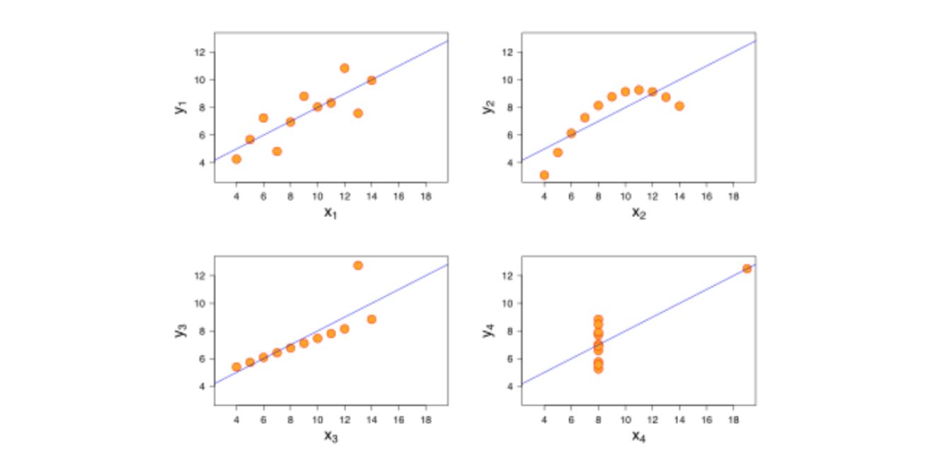 A classical example is Anscombe’s Quartet, with 4 different datasets with 2 variables, x and y. If you do simple summary statistics, you’ll get similar results for all.
