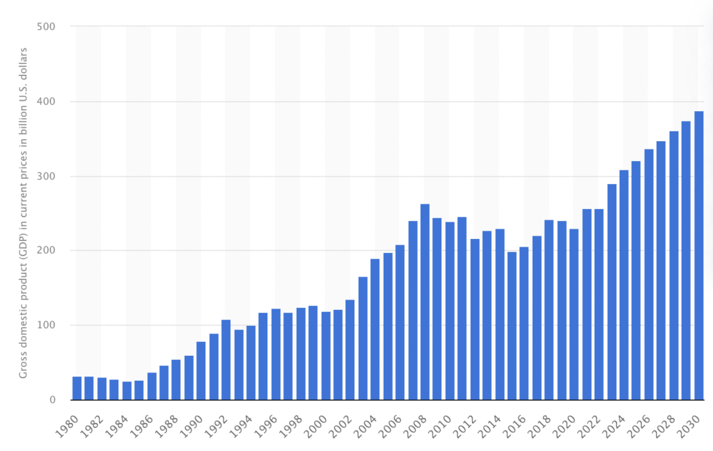 Gross domestic product (GDP) in current prices in Portugal from 1980 to 2030 (in billion U.S. dollars). Source: Statista