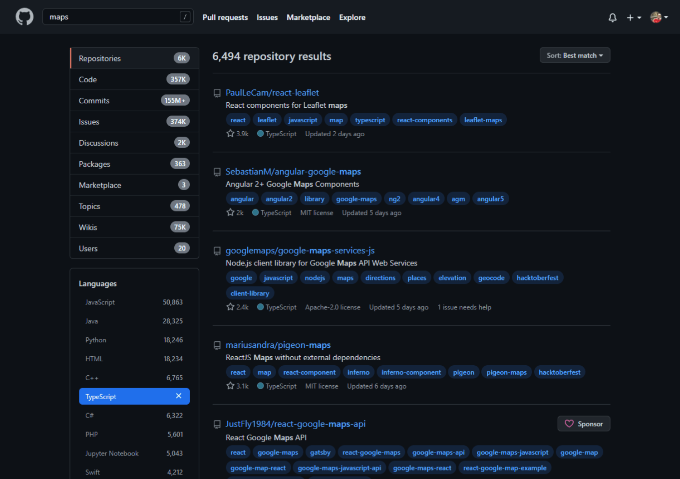 In this example, I searched for the keyword “maps” and selected Typescript as the wanted language. GitHub found me a total of 6,494 different repositories with that keyword in its title or description that I can explore and see if they accept contributions from other developers.