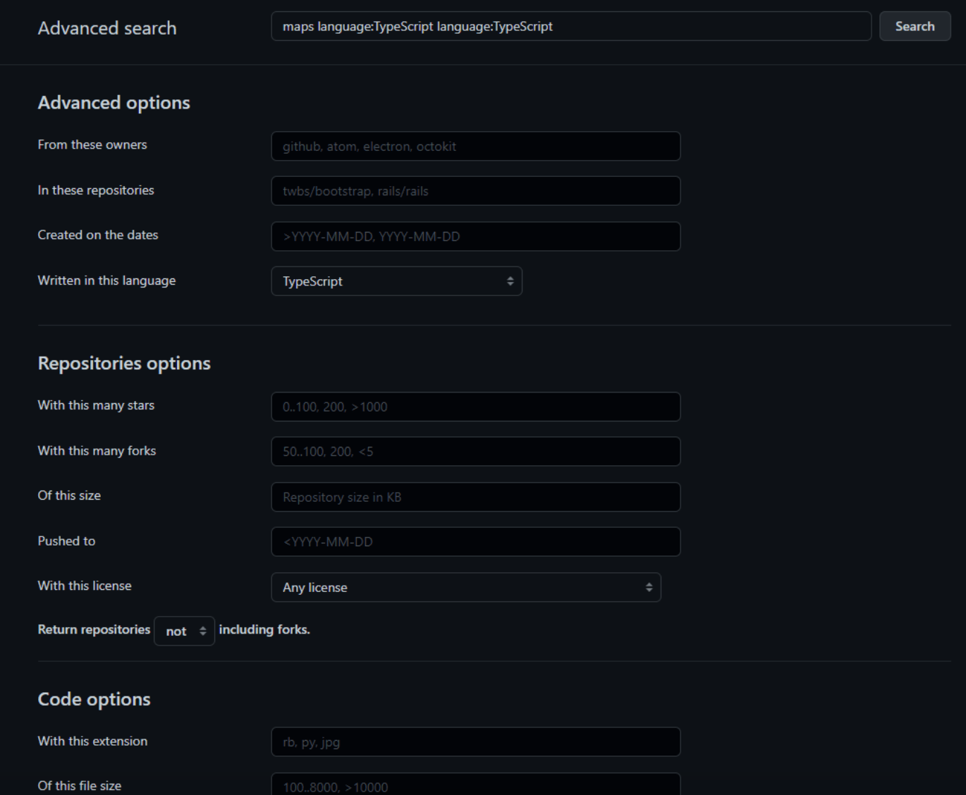 Below the languages list I picked from, you can find an “Advanced Search” label. This will take you to a different page where you can build your own specific query for projects that absolutely match your needs.