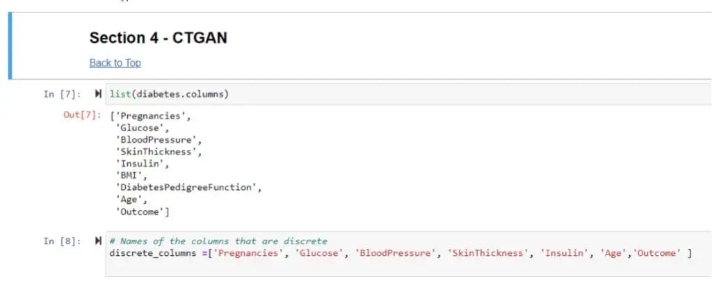 Finalmente podemos começar a implementação da ctGAN. Primeiro é preciso declarar quais as colunas com dados discretos (em oposição aos contínuos) para que a ctGAN não crie dados inválidos.
