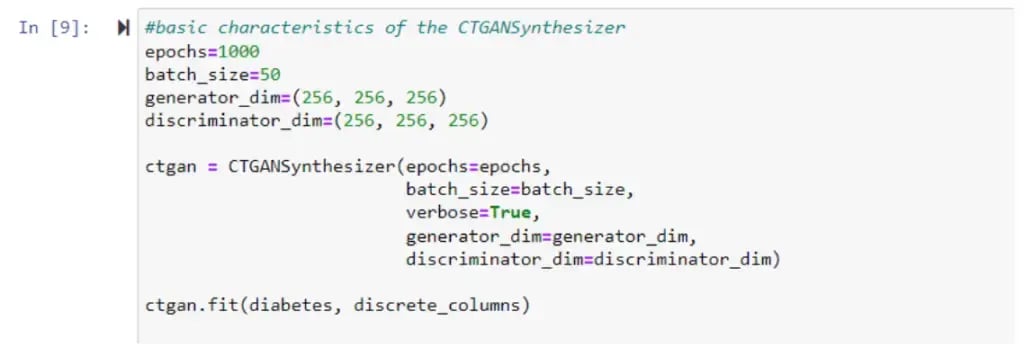 E agora podemos configurar o synthesizer. Podes controlar o número de epochs, o tamanho da batch e as dimensões do gerador e do discriminador. Verbose pode ser configurado para true se quiseres acompanhar o treino da ctGAN.