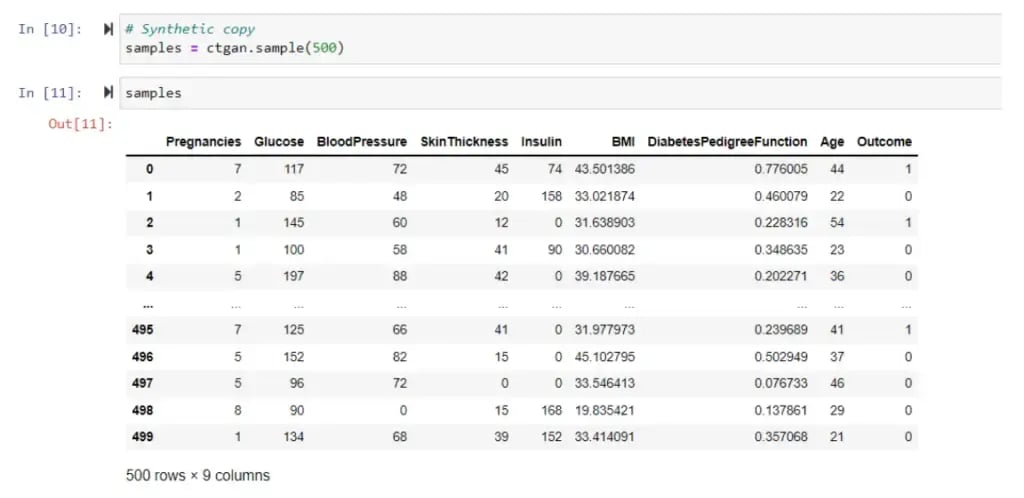Depois de algum tempo (ctGANs demoram algum tempo a serem treinadas) podes gerar synthetic data desta ctGAN de uma forma simples, como vês:
