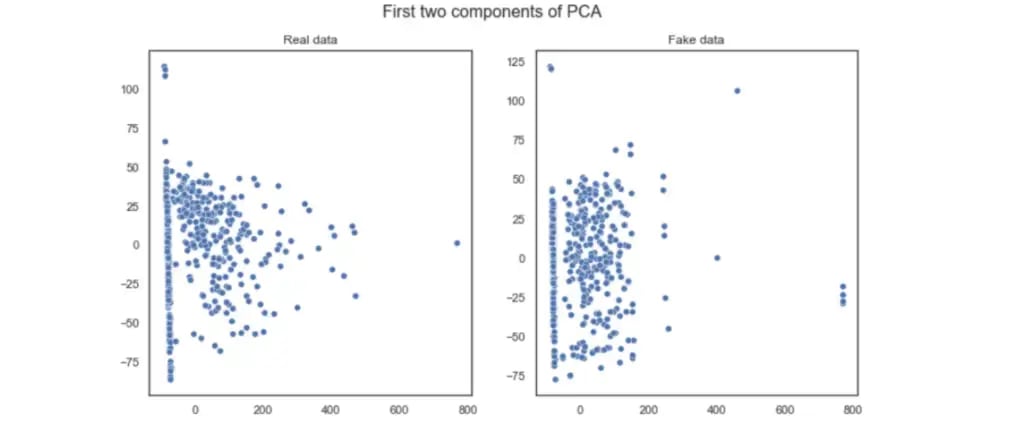Como podem ver no exemplo do PCA abaixo, os dados falsos aprenderam as tendências gerais dos dados reais e as duas dispersões são bastante similares.