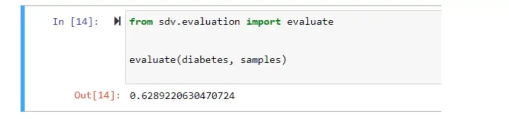 Se quisermos uma verificação objetiva e não visual entre os dados sintéticos e os reais podemos usar a função sdv.evaluate. Esta função agrega resultados de métricas de semelhança entre o dataset real e o sintético e apresenta-os numa escala de 0 a 1, sendo 0 o pior resultado (os datasets são totalmente diferentes) e 1 o melhor (os datasets são indistinguíveis). Como podes ver pelo resultado abaixo, que não é mau, ainda há uma margem de melhoria na ctGAN que pode ser conquistada melhorando os parâmetros do synthesizer.