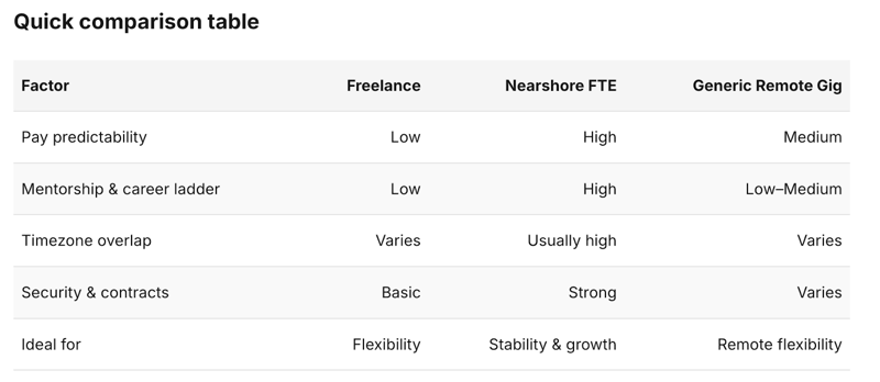 Choosing between freelancing, remote gigs, and nearshore roles isn’t about labels or contract types. It’s about your operating context: how you work, how you grow, how you’re evaluated, and whether your career has continuity or constant resets.